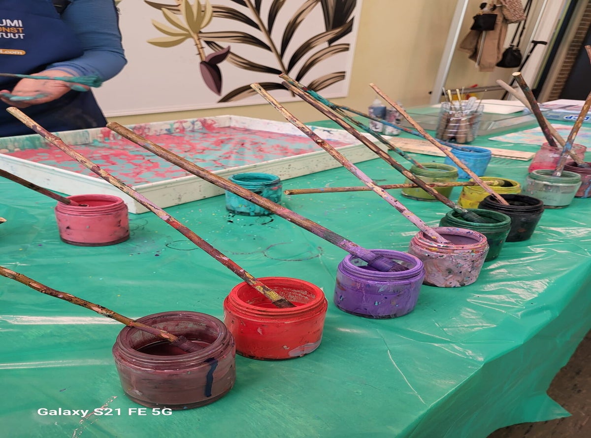 Tijdens de workshop, georganiseerd met de inzet van onze vrijwilligers, kregen de deelnemers de kans om zelf creatief aan de slag te gaan met kleuren die dansen op water. Elk werk werd aan het einde van de dag een unieke en onvergetelijke herinnering om mee naar huis te nemen.